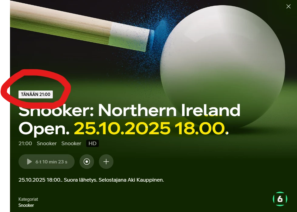 Alkuperäinen ohjelman nimi on: “Snooker: Northern Ireland Openin välierä”