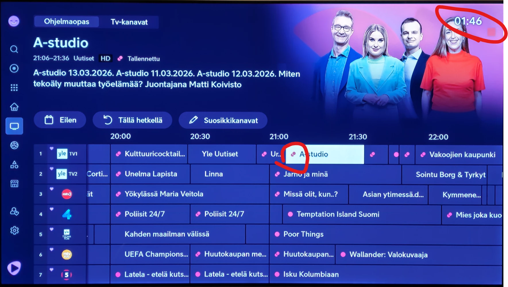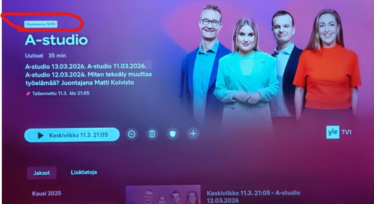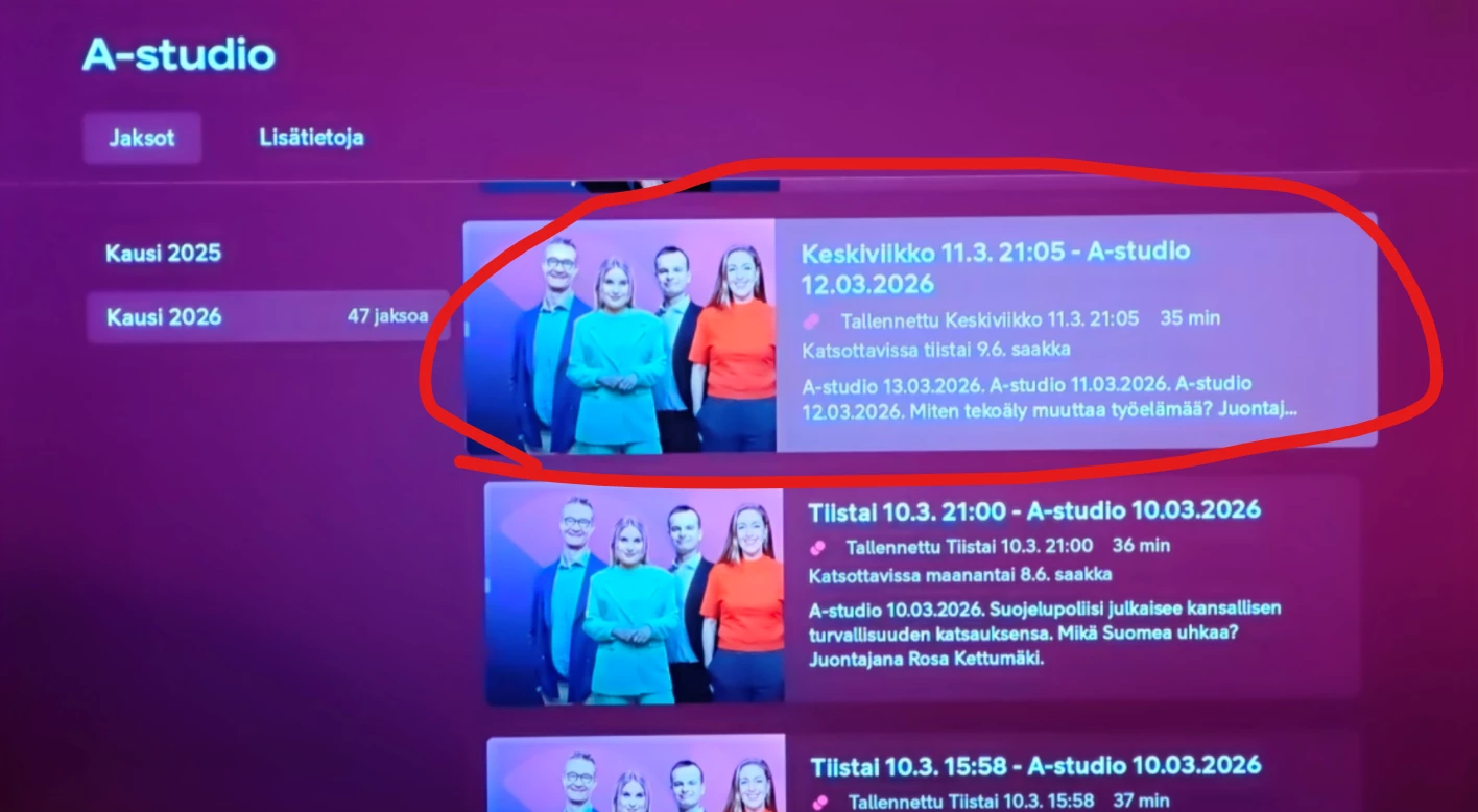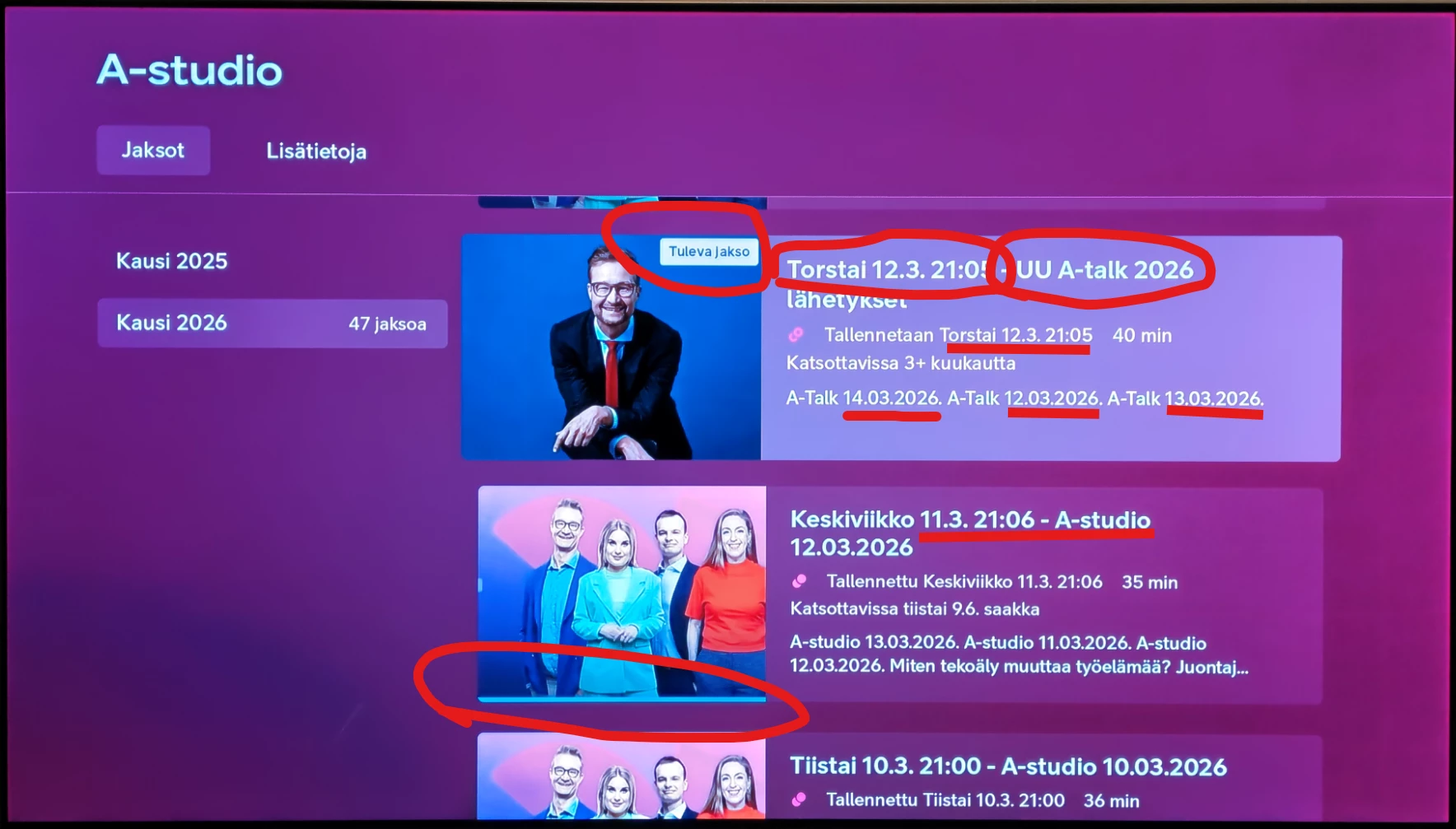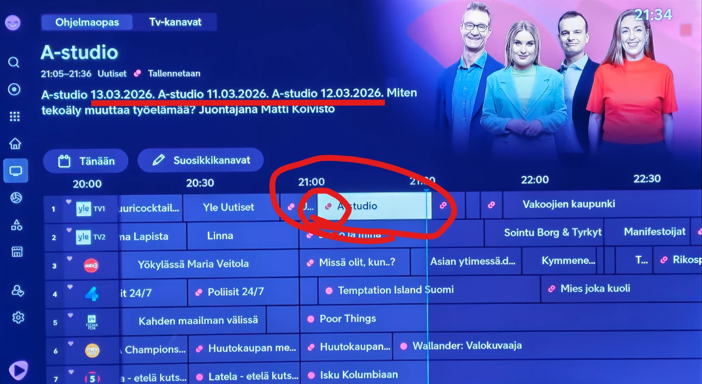 A-studio on nyt pari kertaa katkennut kesken juontajan puheen. Tänäänkin 9.3 kesken lauseen. Kuulisin mielelläni seuraavan päivän aiheet mitä usein sanotaan lopuksi.