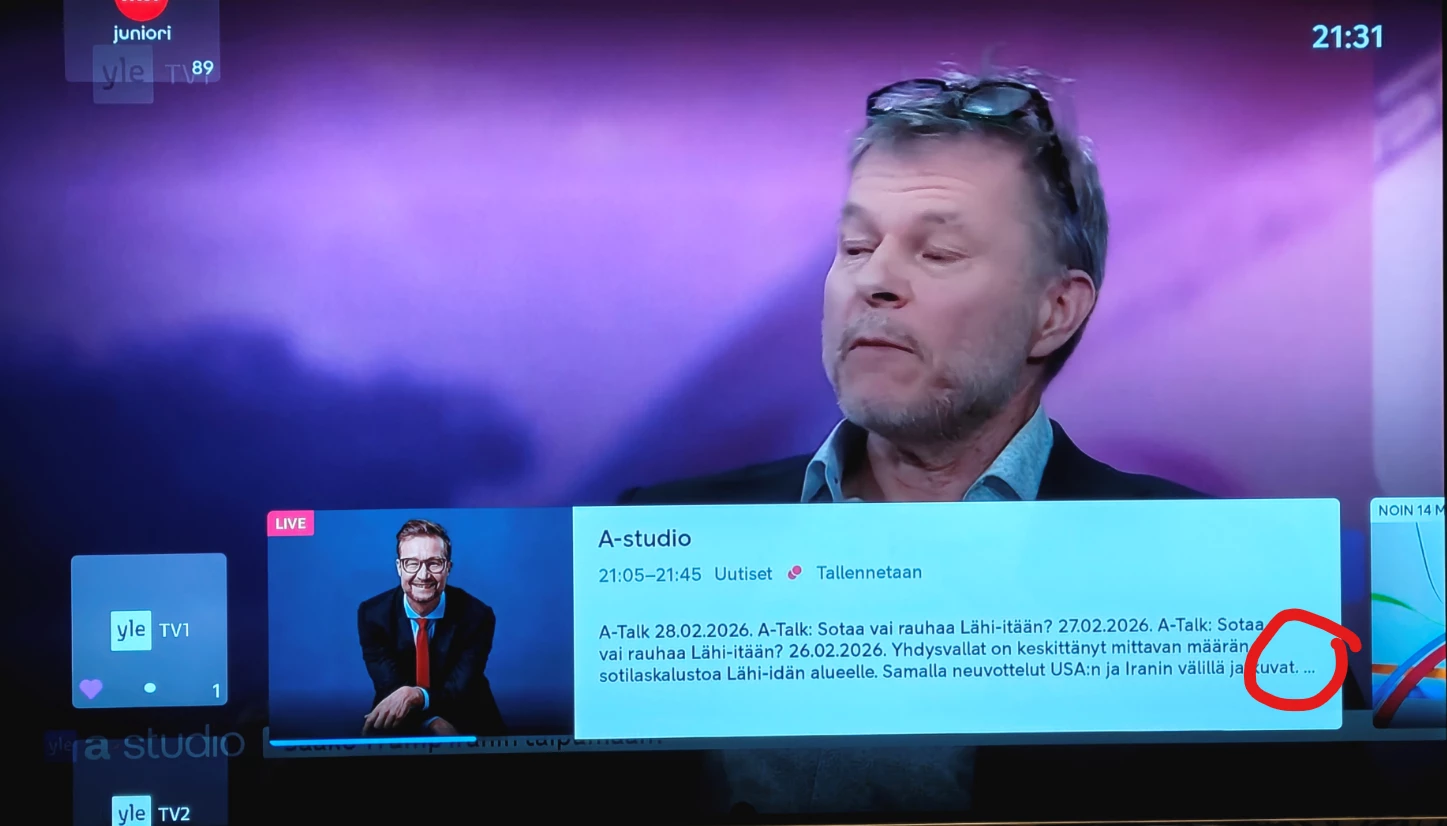 Punakynällä merkkasin järjettömyyksiä mitä aina näissä ohjelmatiedoissa - tuossa ohjelmaa koskevassa tekstissä on kaikkialla aina päivämääriä, jopa päivämäärälistoja. Yhdellä lauseella periaatteessa kerrottu se ko. ohjelman/ohjelmajakson sisältö. Ohjelman nimet pätkitään!!
