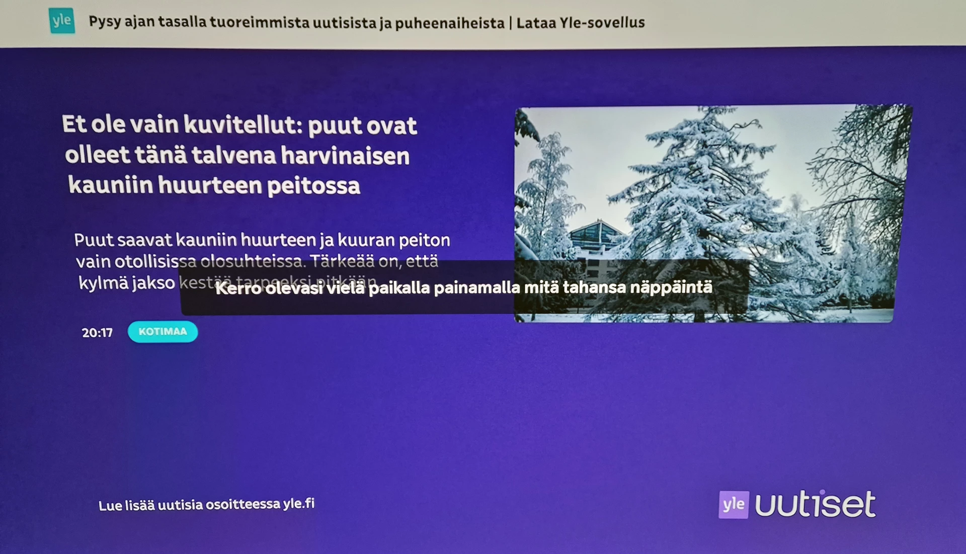 PS. Jos käyttäjä on maksanut Telia TV:n kuukausimaksun → käyttäjällä on oikeus katsoa yhtä ja samaa kanavaa vaikka koko kuukauden putkeen koskematta kaukosäätimeen. Tv-lähetys ei saa sammua popupiin, joka voisi pahimmillaan palaa kiinni esimerkiksi OLED-tv:n / wanhan plasmatv:n näyttöön (“Oletko vielä siellä?”-teksti on nimittäin valkoisella tekstillä keskellä ruutua).