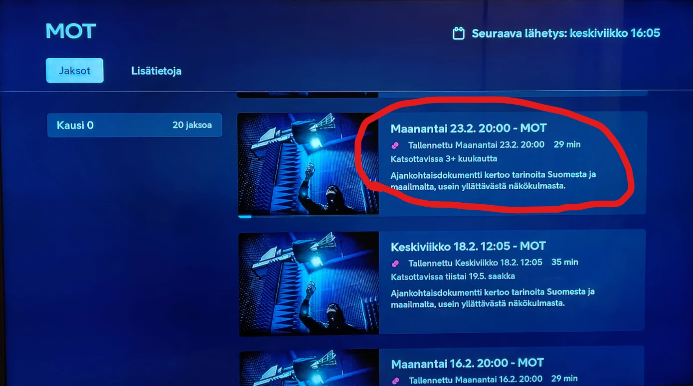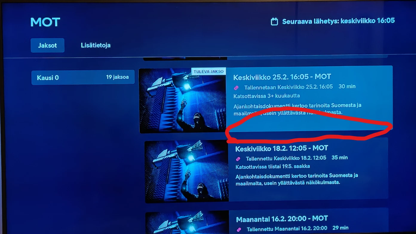 Se ei vain lopu nuo ykkösen tallennus ongelmat. Tänään maanantaina ei ollut tallentanut taas A-studioa. Oli sarjatallennus lähtenyt pois vain tältä päivältä. Keskiviikkona näkyy tallennus taas olevan aktivoituna. En vain muista tai ole kotona aina tarkastamassa, että toimiiko tallennus vai ei. Toivottavasti oli tylsä aihe tänään, tai itseasiassa eilen, kun vrk on vaihtunut jo.
