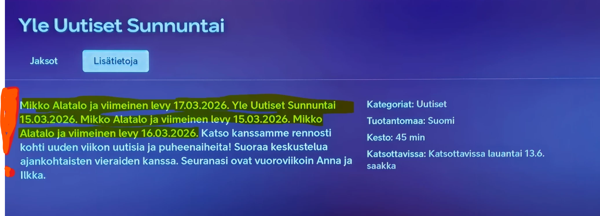 Mutta tämähän täytyy olla jokin outous siinä kuinka metatietoja luetaan ja käytetään kun näytetään ohjelmatietoja missäkin tilanteessa ja milläkin alustalla. Heitetään kolikkoa tahi noppaa mitä tietoja näkyy🤔
