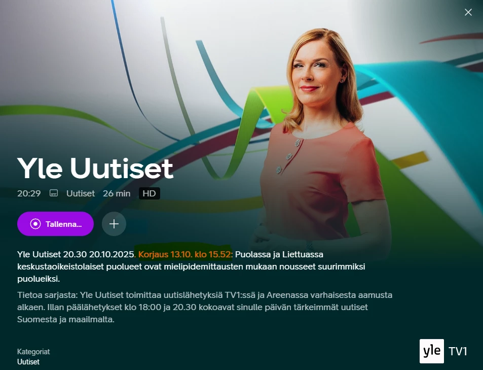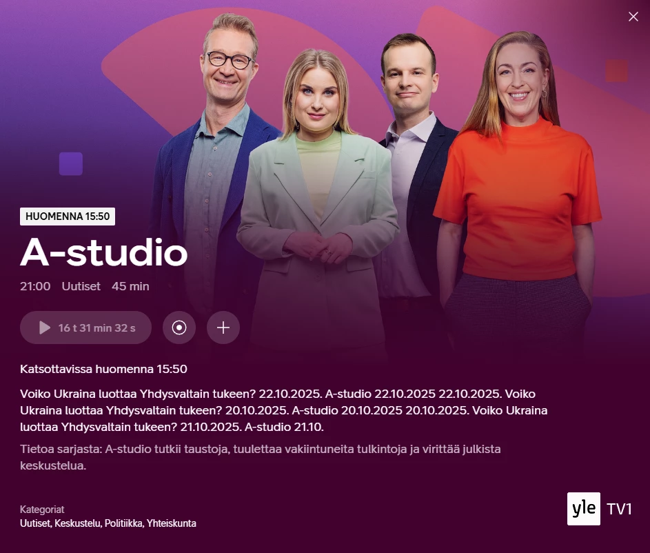 Vikaa ja puutteita Telia Play-ohjelmaoppaassa koskien päivittäin näkyviä ns. ajankohtaisohjelmasarjoja. INFO-tiedoissa puuttuu päivän ohjelman tiedot, on väärän päivän tiedot tai jopa lista seuraavien päivien lähetysajoista. Jaakko Saariluoma taisi olla tuossa viikon verran Puoli seitsemän -ohjelman vieraana putkeen 😂