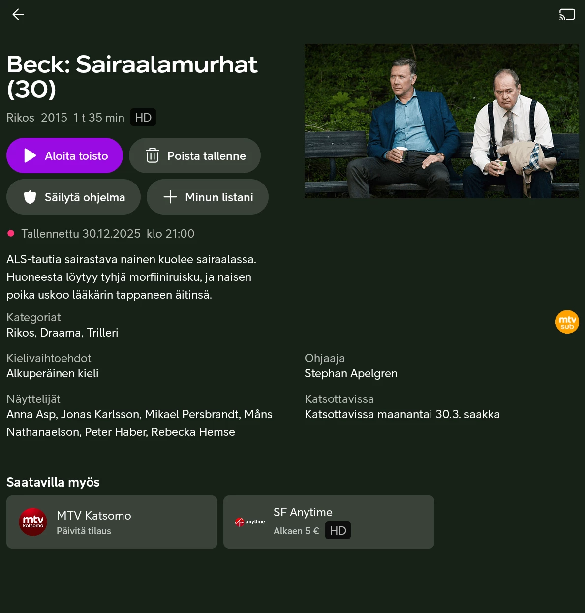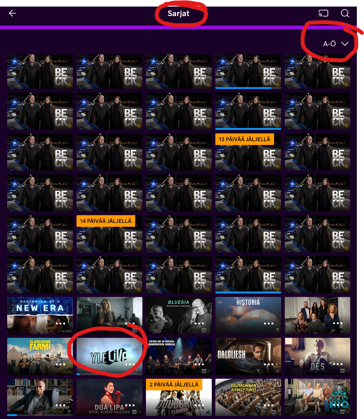 Alla on kuva tallennuksista, ja sieltä Sarjat-osio ja valittu aakkosjärjestys. Rullasin tuohon erääseen ongelmakohtaan mainitussa listassa, eli BECK-elokuvat, miksihän ne ovat Sarjat-osion alla?? Perinteisesti kun käyttöliittymää suunniteltiin, niin se ominaisuus jolla tulokset on järjestetty on näkyvillä myös listauksessa - tuo valittu A-Ö lienee se ohjelma(sarja)n nimi. Listalla on vain kuvia, ilman tai kera nimien (jos kuvissa).. Ja sentään joskus tuota järjestystä sai edes vaihtaa päinvastaiseen halutessaan - ei sitäkään enää