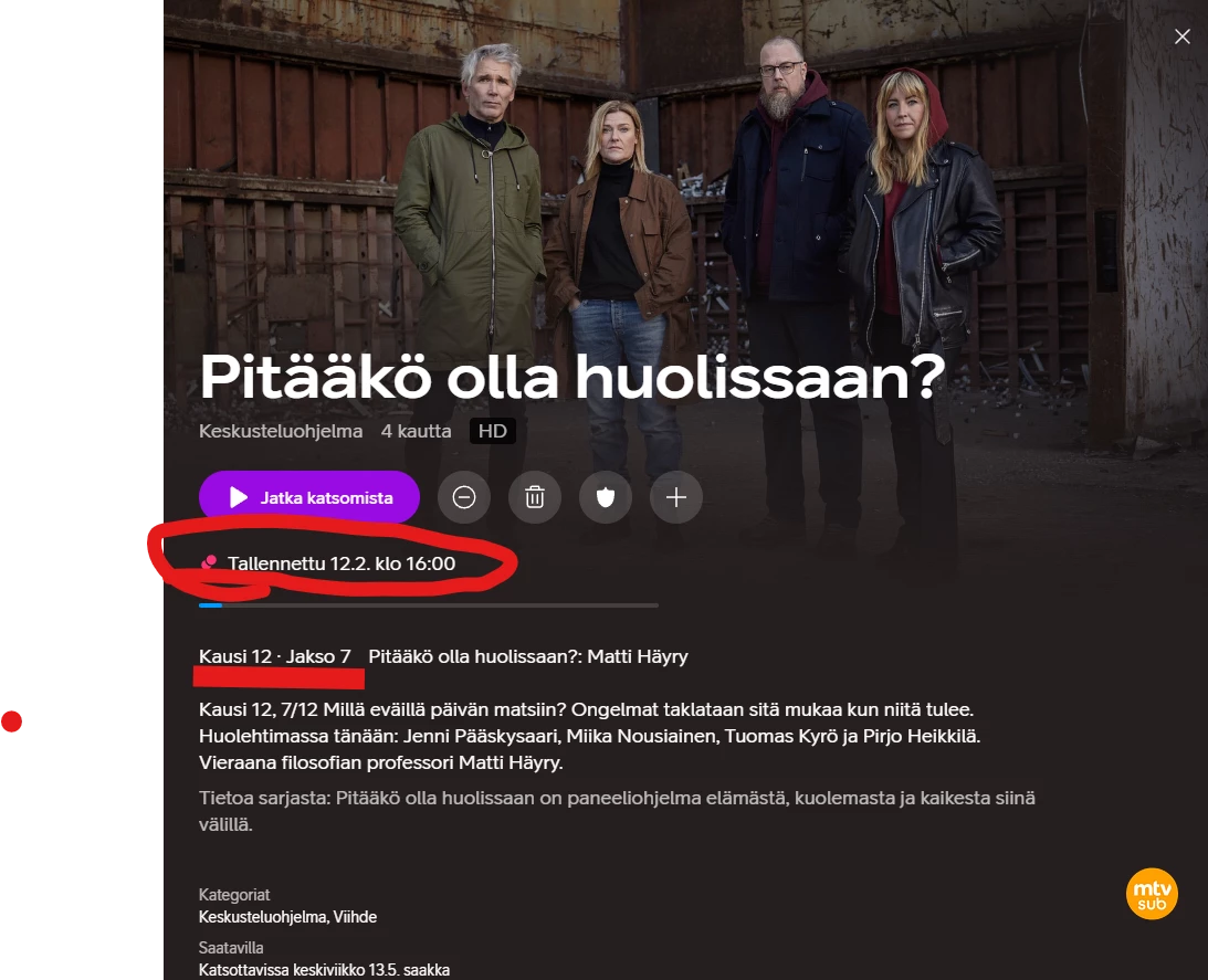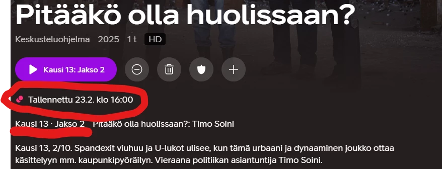Viimeisin jakso kuitenkin ollut ja tallennettu 23.2.2026 klo 19:00