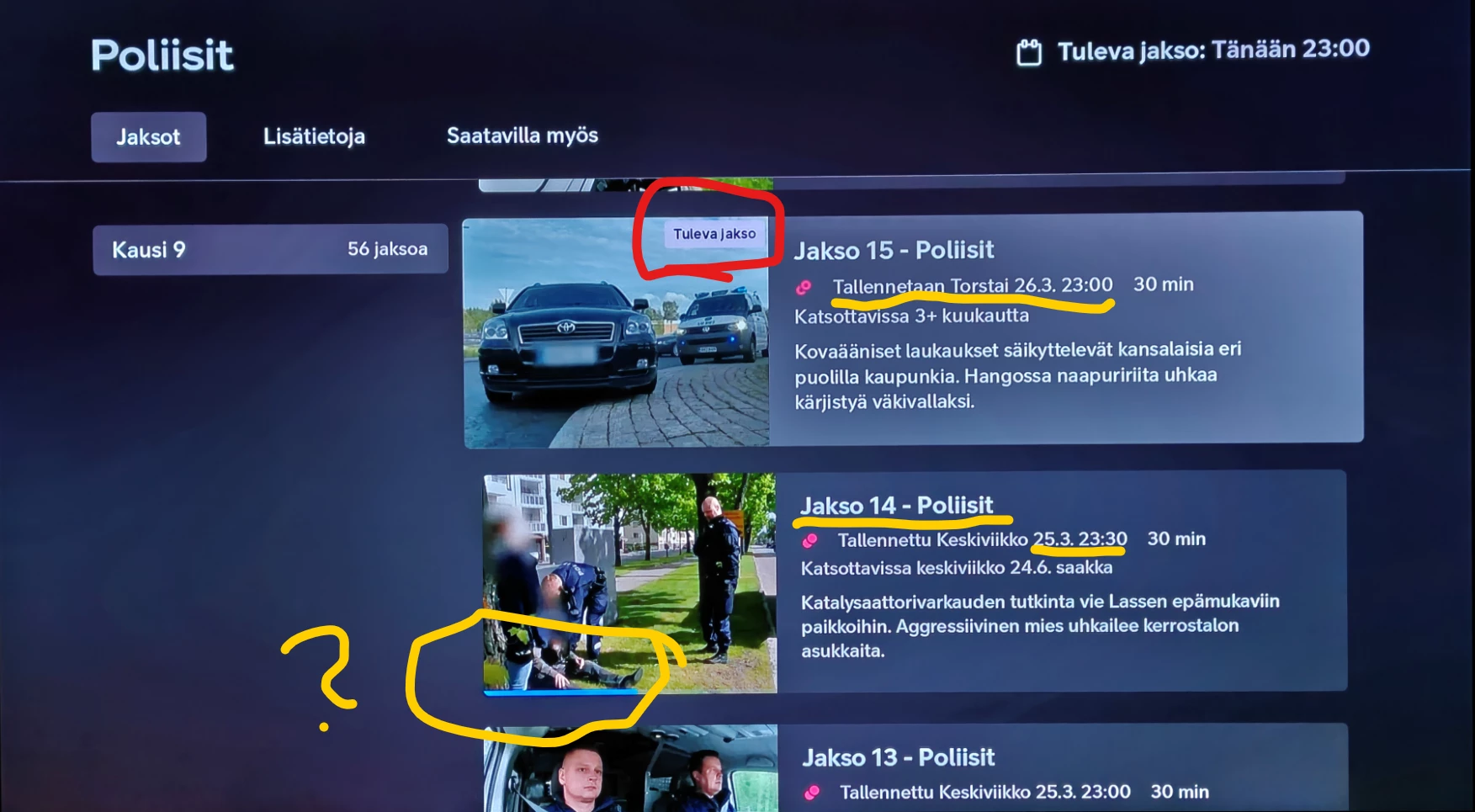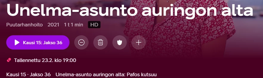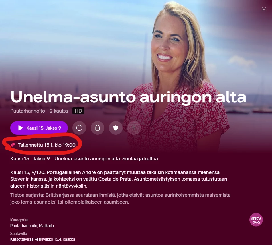 Ihmetyttänyt sillointällöin miksi sarjatallennusten esittelyssä ei olekaan se viimeisin tallennettu jakso niinkuin varmaankin tarkoitus. Näin käy esimerkisti “Unelma-asunto auringon alta” -sarjan osalta kun sen avaa Sarjat-kategoriasta