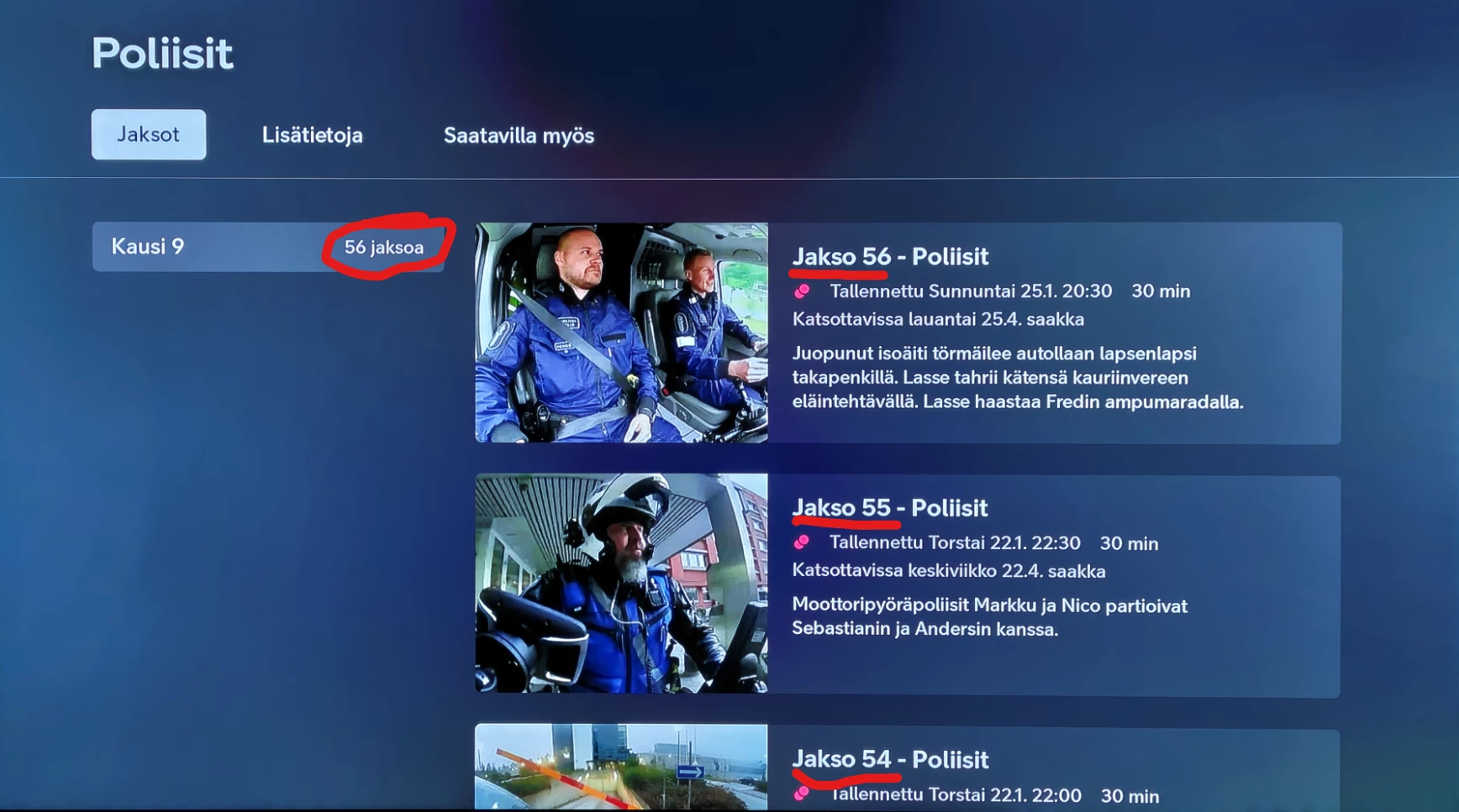 Aika haastavaa myös löytää listalta tuo viimeksi tallennettu kun sarjan jaksot lueteltu vanhimmasta uusimpaan