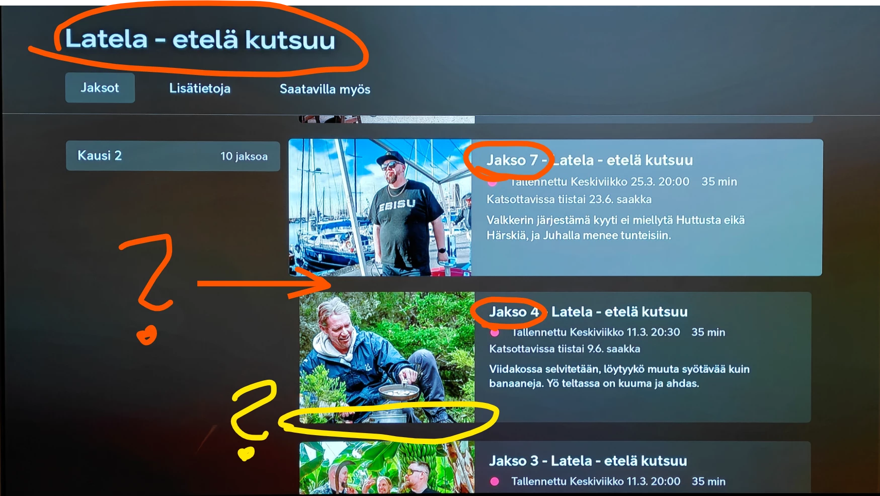 Jaksojen 4 ja 7 välistä puuttuu 2 jaksoa ajalta 18.3.2025. Itselläni tuo on sarjatallennuksessa.