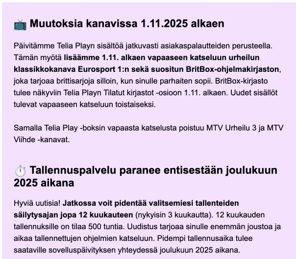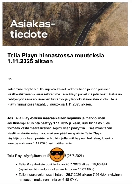 ”Lisäsimme tähän viestiin määräaikaisen sopimuksen päättymispäivän Telia Play -käyttäjätunnuksen perään sulkuihin, jotta voit helposti tarkistaa, tuleeko muutos voimaan 1.11.2025 vai myöhemmin”.