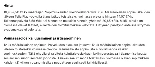 En pysty myöskään tarkistamaan tehdyn sopimuksen oikeellisuutta Minun Teliassa, sillä siellä ei näistä TeliaPlay sopimusten hinnoista kerrota mitään. Pitää odottaa seuraavaa laskua.