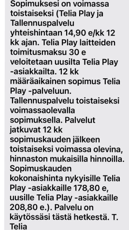 Luotan siihen että Telia myymälässä tekemäni sopimus pitää, mutta mielestäni Telian kokoinen yritys voisi suhtautua näihin sopimusteknisiin asioihin tarvittavalla vakavuudella, eikä vähän sinne päin.