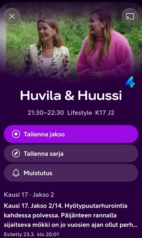 Seuraava uusinta: Huvila & Huussi 25.3.2025 klo 21:30 TV4