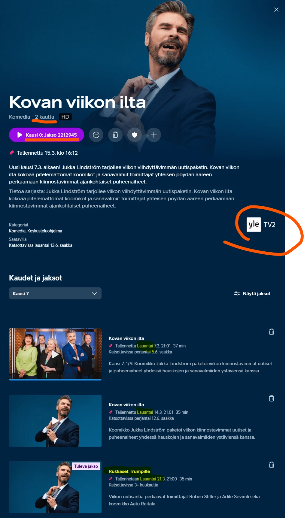 Haluaisin myös kiinnittää huomion siitä että jokaisen jakson kohdalla on täysin erilaiset tiedot jaksosta. JOnkin kohdalla kausi/jakso, yhden kohdalla jopa jaksolle nimi “Rukkaset Trumpille” ja peräti mukana olevat toimittajat, toki tästäkin se vieras puuttuu..