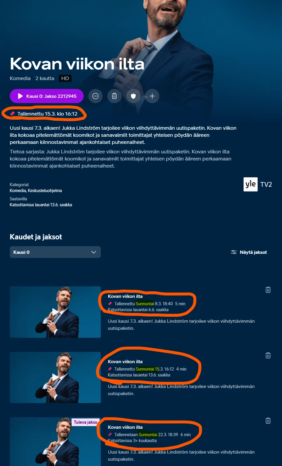 Kiitokset huomioista! Ilmeisesti siellä on ohjelmien mediatiedoissa jokin pieni poikkeama ja sen vuoksi jokainen tallentuu nyt erikseen. Testailimme myös itse ja vinkkasimme tästä eteenpäin, joten asia on nyt tutkinnassa.