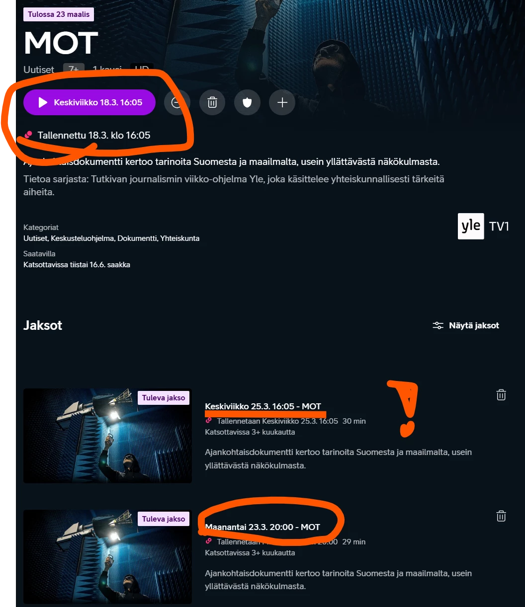 Ei tätä itse ongelmaa ole korjattu. Yle esittää MOT-jakson aina maanantaina klo 20:00 ja uusinta tulee keskiviikkona päivällä.