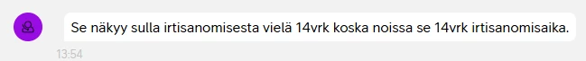 Otin yhteyttä aspaan taas ja sieltä lähetettiin linkki peruuttamislomakkeeseen ja aspan työntekijä lopetti chatin samalla kun laittoi linkin, ei antanut mahdollisuutta edes vastata. Täytin tuon peruuttamislomakkeen 8.10, mutta en ole vieläkään saanut liittymää peruutettua.