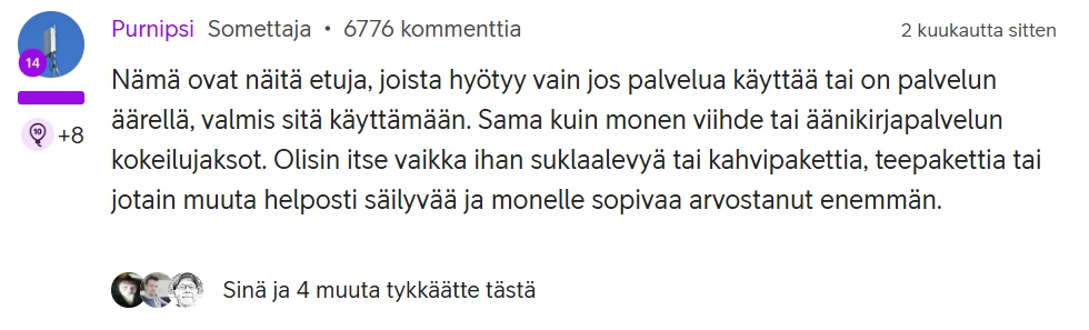 Nämä ovat näitä etuja, joista hyötyy vain jos palvelua käyttää tai on palvelun äärellä, valmis sitä käyttämään. Sama kuin monen viihde tai äänikirjapalvelun kokeilujaksot. Olisin itse vaikka ihan suklaalevyä tai kahvipakettia, teepakettia tai jotain muuta helposti säilyvää ja monelle sopivaa arvostanut enemmän.