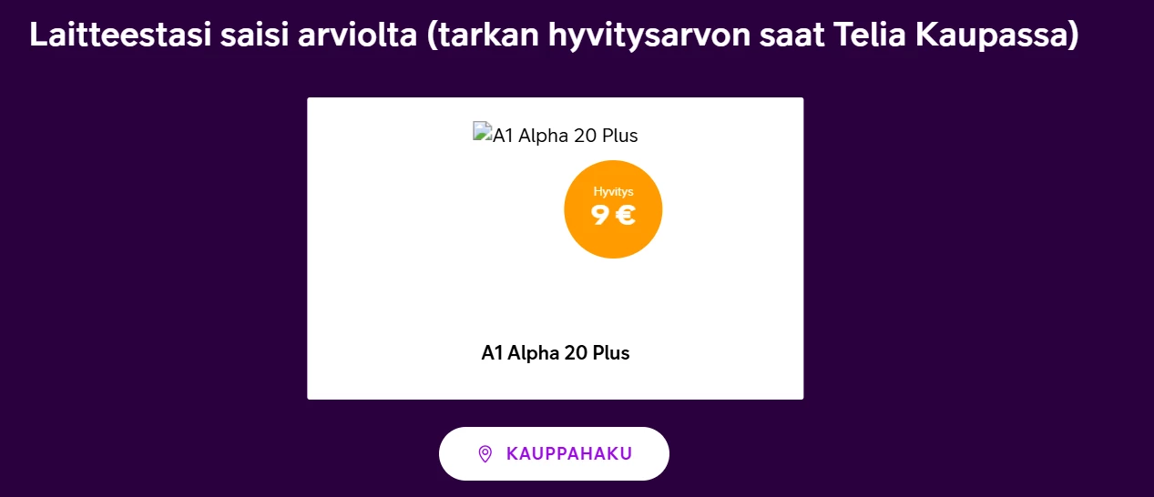 Telia lupaa vanhasta puhelimesta kierrätysedun kun ostaa uuden laitteen: “Kierrättämällä saat aina etua”, “Vanha puhelimesi on kirjaimellisesti kullan arvoinen”. Ostin sitten Telian liikkeestä Honor 400 5G puhelimen toukokuun lopussa ja tarjosin vaihtoehtona kierrätysetuun joko Huawei tai Nokia älypuhelinta, kumpikin ehjiä mutta vanhoja toki. Myyjä tarkasti kummastakin IMEI-koodin ja valitteli ettei nämä ole hänen listallaan kierrätysetua varten. Nyt huomasin Telian sivuilla laskurin, jonka mukaan kumpikin laite olisi ollut 9 euron kierrätysedun arvoinen. Tietysti laskurin tuloksessa lukee isolla kirjoitettuna “Laitteestasi saisi arviolta (tarkan hyvitysarvon saat Telia Kaupassa)” Eli tarkka arvio Telia kaupassa oli pyöreä 0 euroa kummallekin laitteelle! Onko Telian kierrätyskampanja taas kerran vain suuri sumutus?