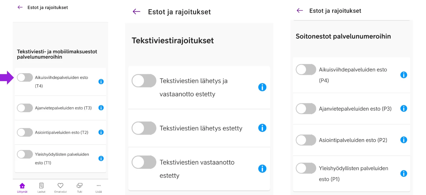 T4 eli aikuisviihdepalveluiden esto estää viestit ja maksamisen aikuisviihdepalveluihin ja 178- ja 179-alkuisiin numeroihin.