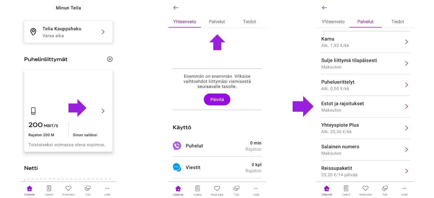 Voit rajoittaa liittymän tekstiviestipalveluita, mobiilimaksuja ja soittoja palvelunumeroihin Minun Teliassa niin sovelluksessa kuin selaimellakin.